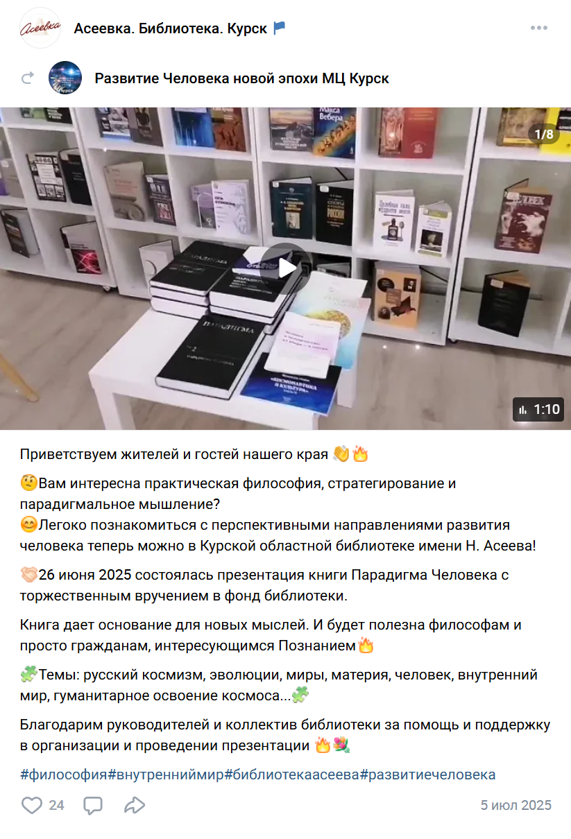 Сейчас курский «метагалактический центр» проводит «философские игры» и читает лекции о космосе. В прошлом году они презентовали книги своего основателя Виталия Сердюка в библиотеке им. Асеева, торжественно вручив их фонду библиотеки, чем Асеевка даже поделилась в соцсетях.