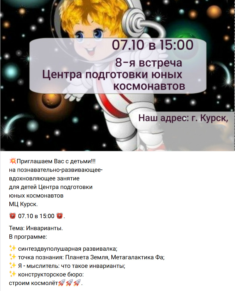 «Центр подготовки юных космонавтов» тоже нашелся — это оказалась серия мероприятий для детей в офисе организации. Среди активностей: игра-квест «Генезис способностей», «игротека для метагалактических математиков», «синтездвуполушарная развивалка», рассказы про «Метагалактику Фа» и «инварианты».
