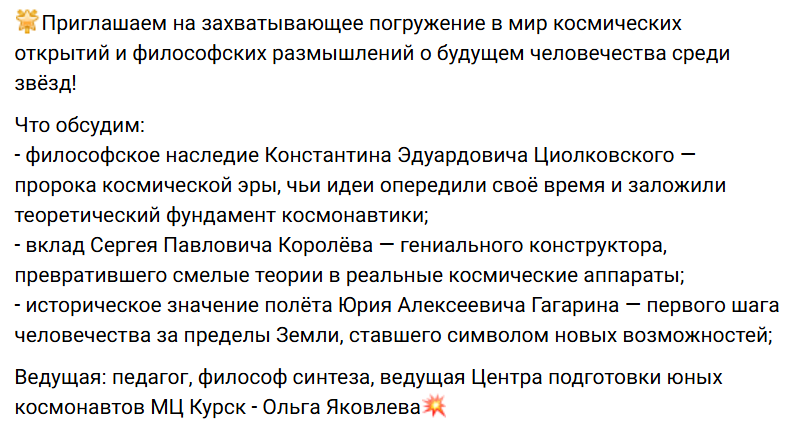 Среди анонсов городских мероприятий — пост о лектории «Мы в космосе», проходящем в одном из городских пространств. Афиша интересная: тут и про философское наследие Циолковского, и про вклад Королёва, и про полёт Гагарина. И лектор — «педагог, философ синтеза, ведущая подготовки «Центра юных космонавтов МЦ Курск».